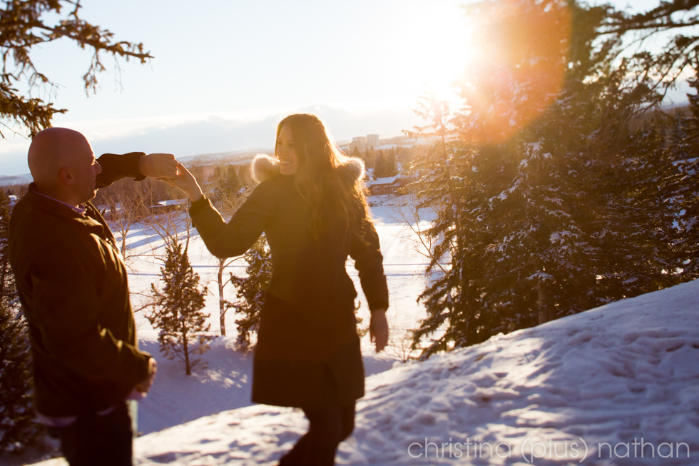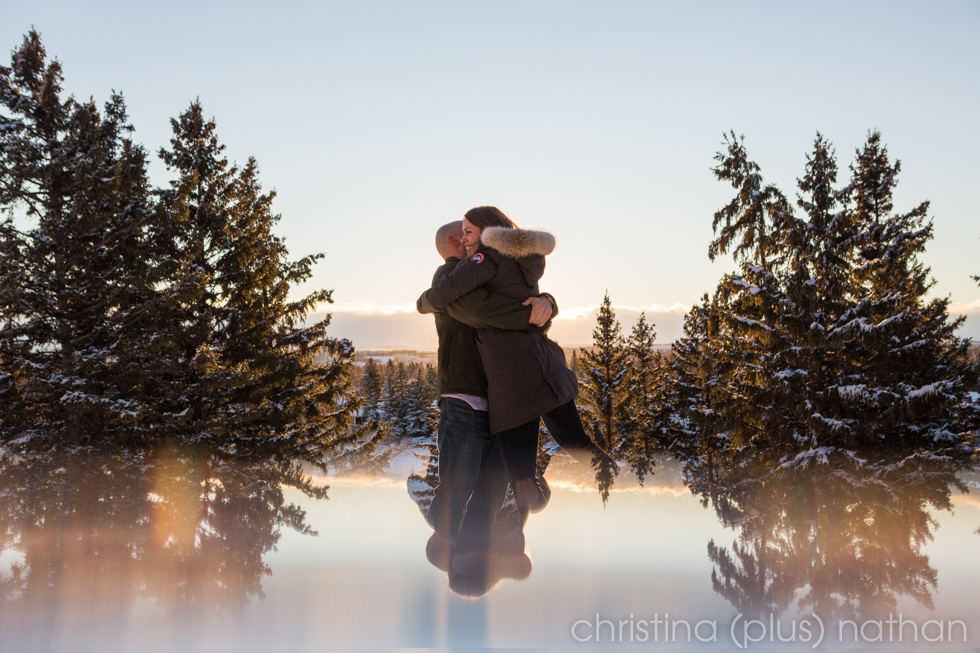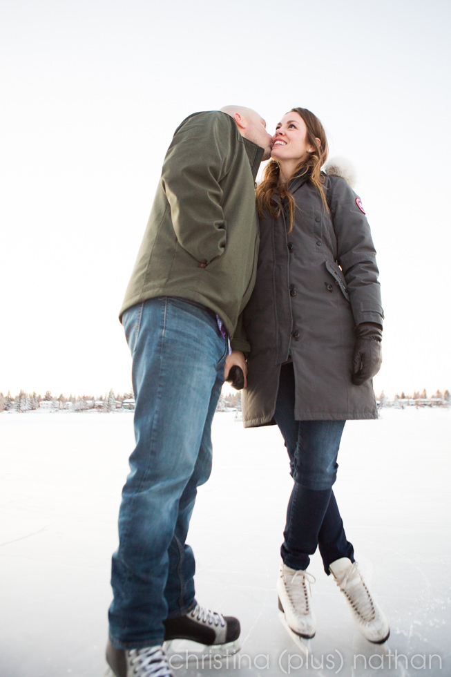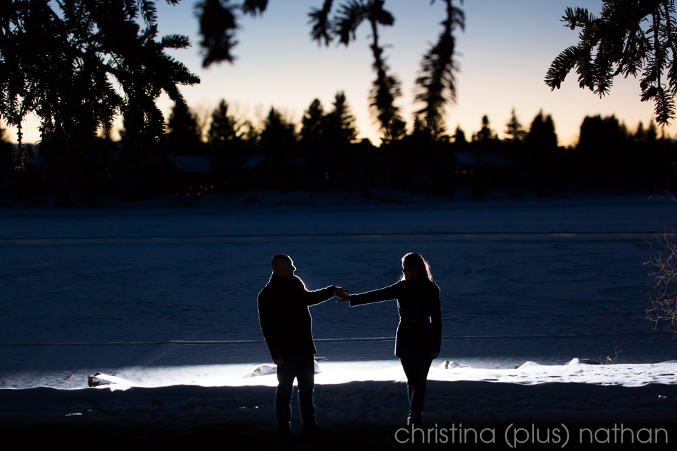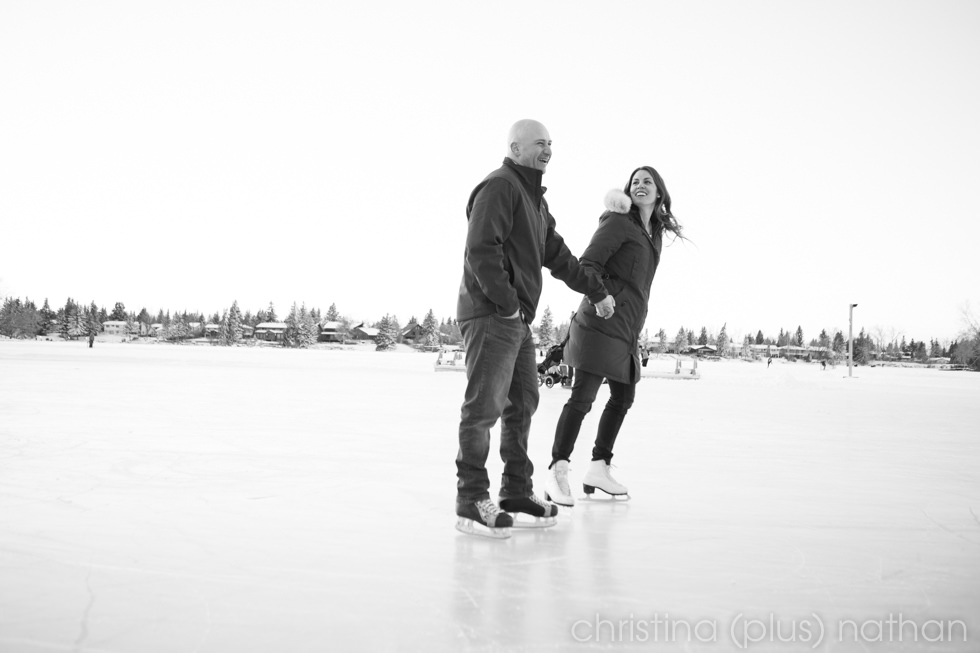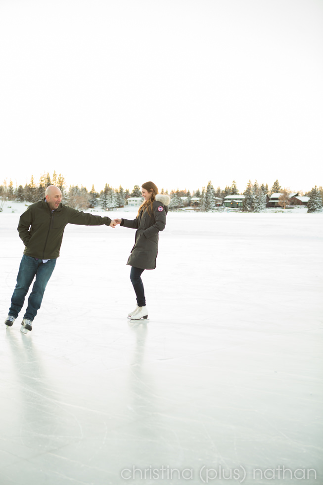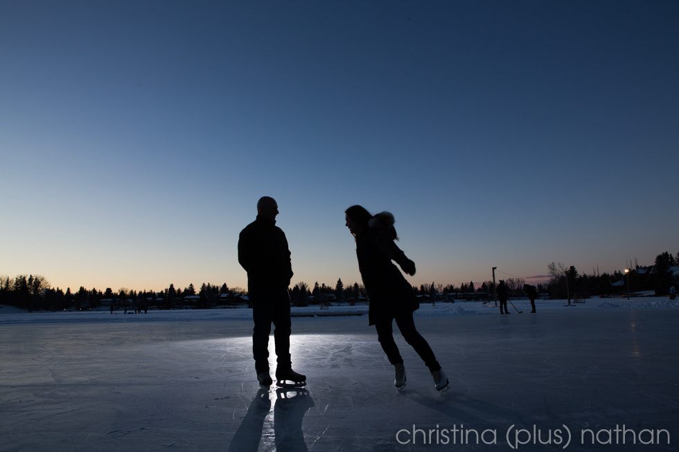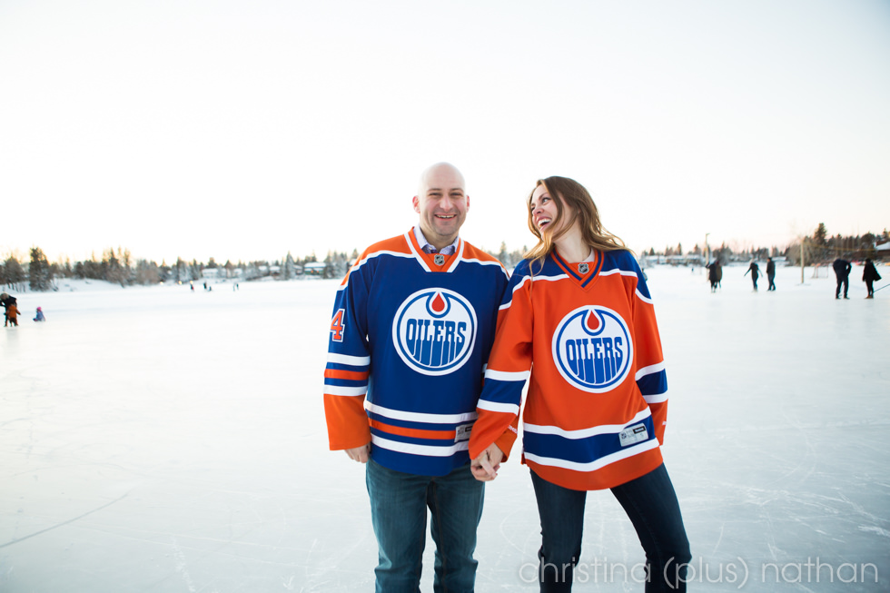 We spent a lovely and cozy afternoon with Melanie and Tyson for their Lake Bonavista winter engagement. They are getting married at The Lake House restaurant in March. Figure skating and hockey were important to these two, so we wanted to get some ice time before it melts. And, these two know their way around a rink on their edges, that’s for sure. And, even though I saw Melanie’s Leafs sweater peeking out from their bag, love conquered all, and she presented a united front, wearing a jersey from (Tyson’s also beloved, and storied) Oilers. 🙂